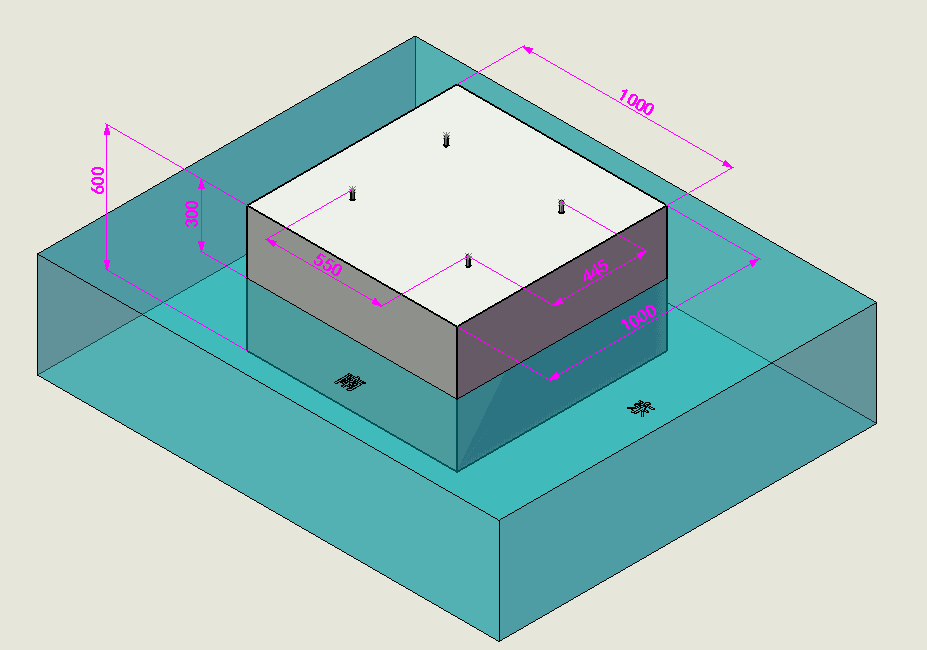 3、按下圖澆筑混凝土地基,外形尺寸(長(zhǎng)X寬X高)=100CM*100CM*60CM,露出地面高度30CM,預(yù)埋四顆M12*120mm鐵膨脹螺栓,螺栓露出地基高度30mm左右,中心距550X445mm,需保持螺栓垂直,不能有歪斜情況。